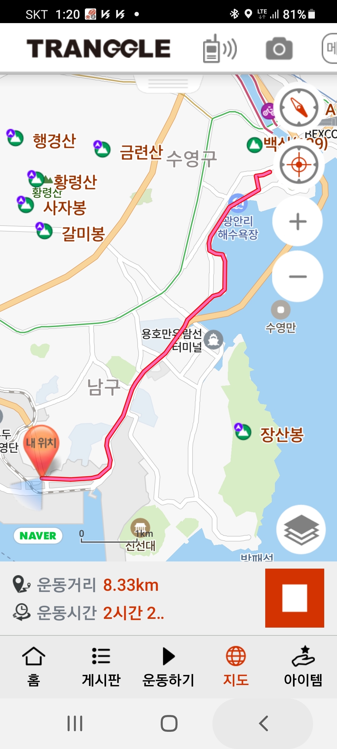 도보거리:8.5km 소요시간:2시간 100회중 (7회)28일pm11시20분=>29일am1시20분