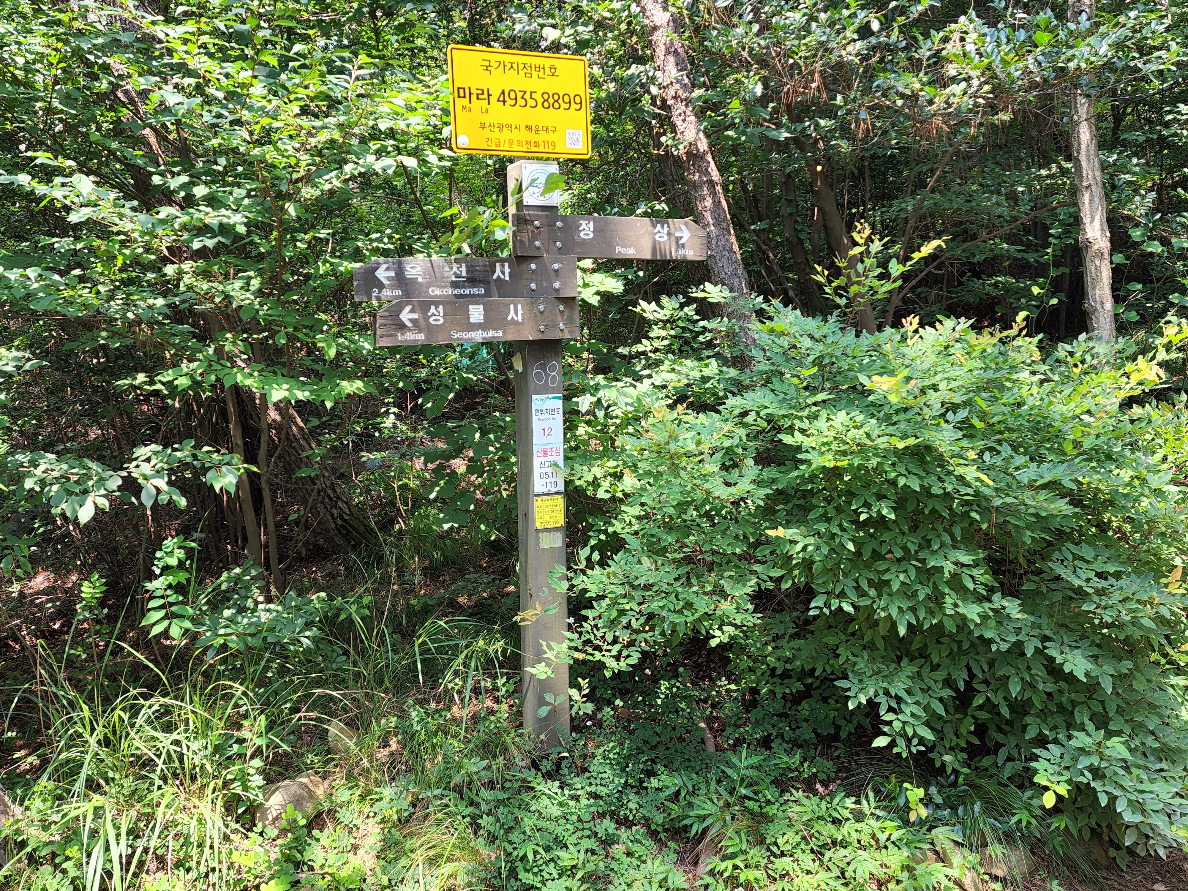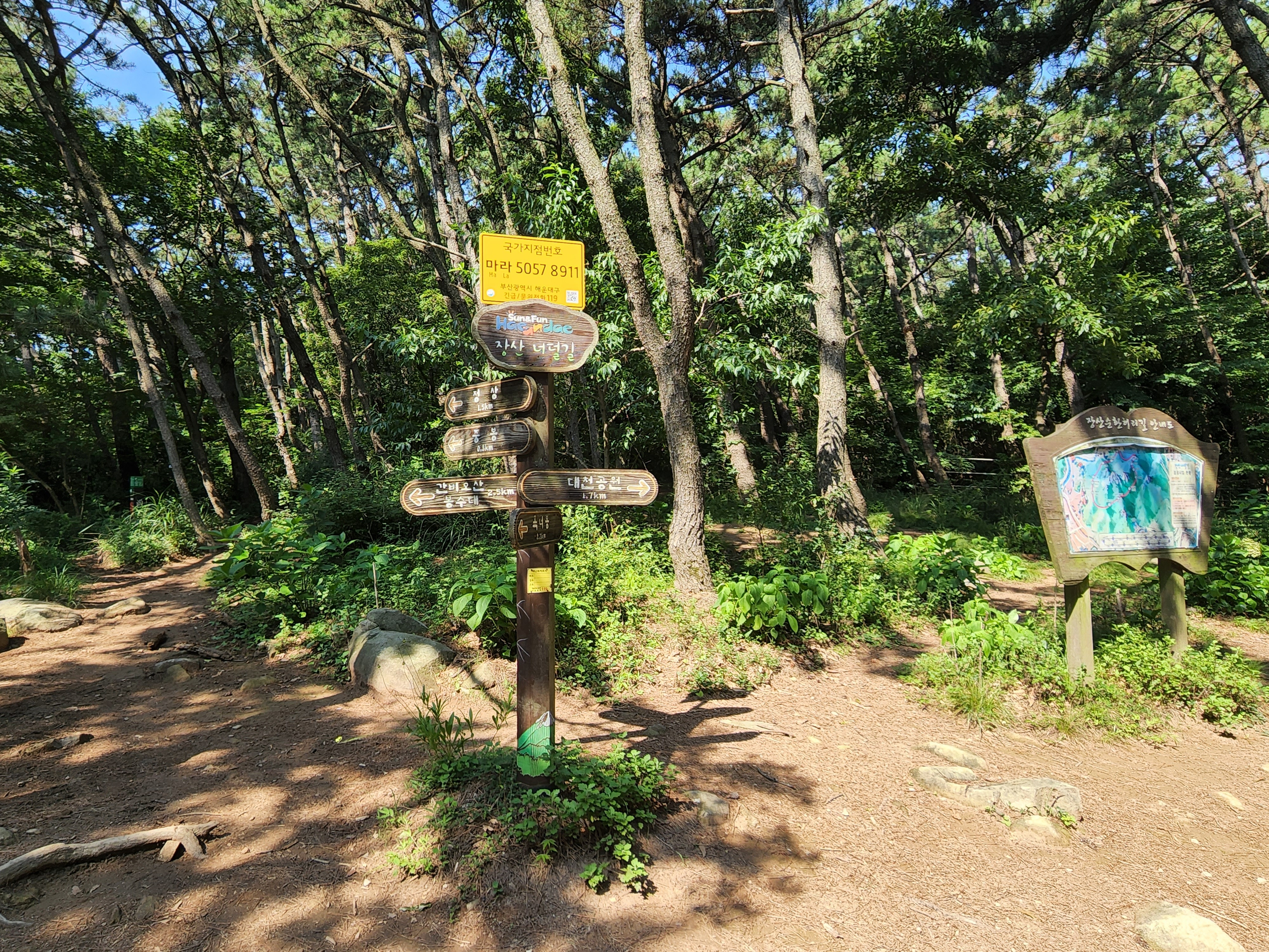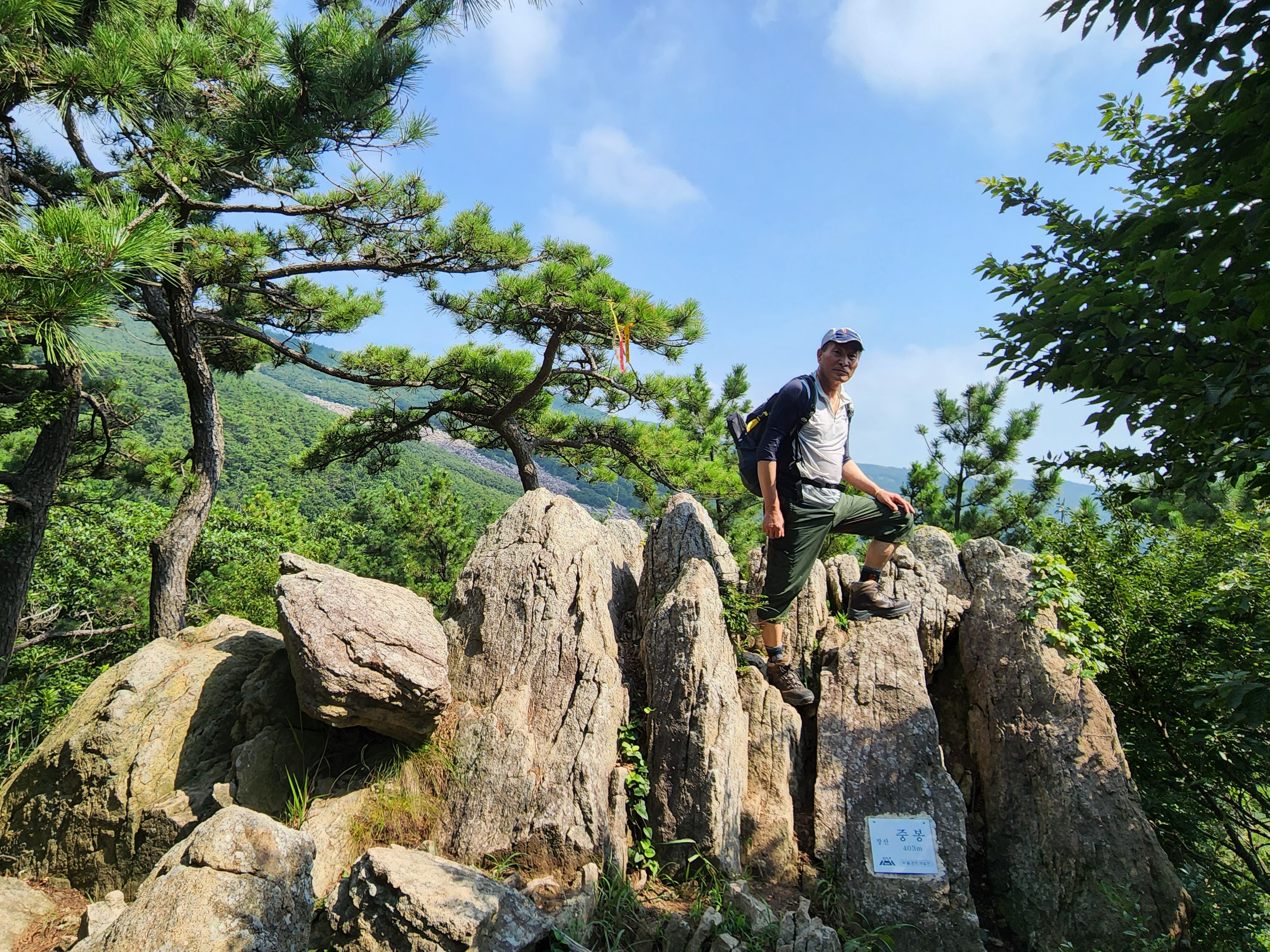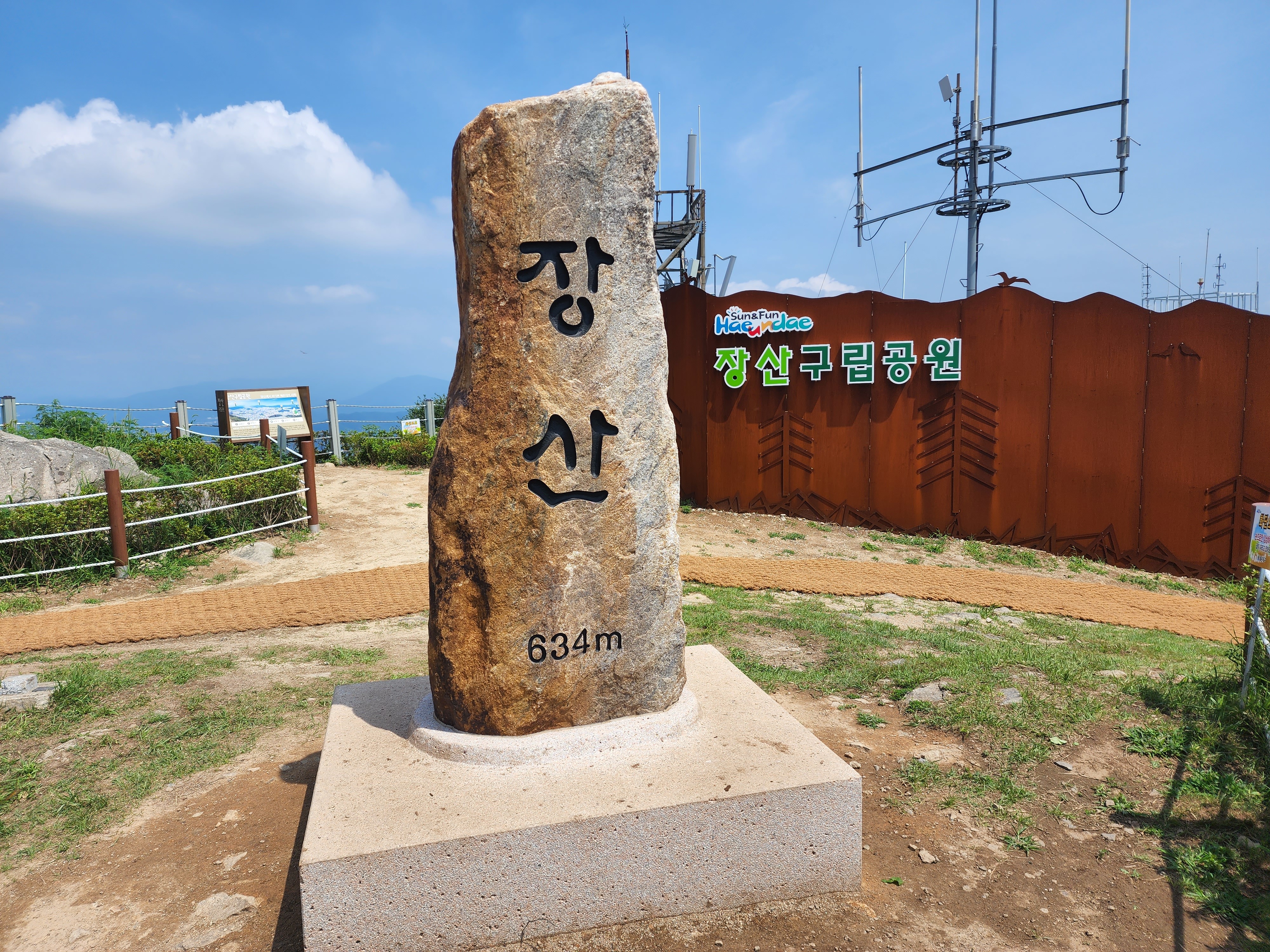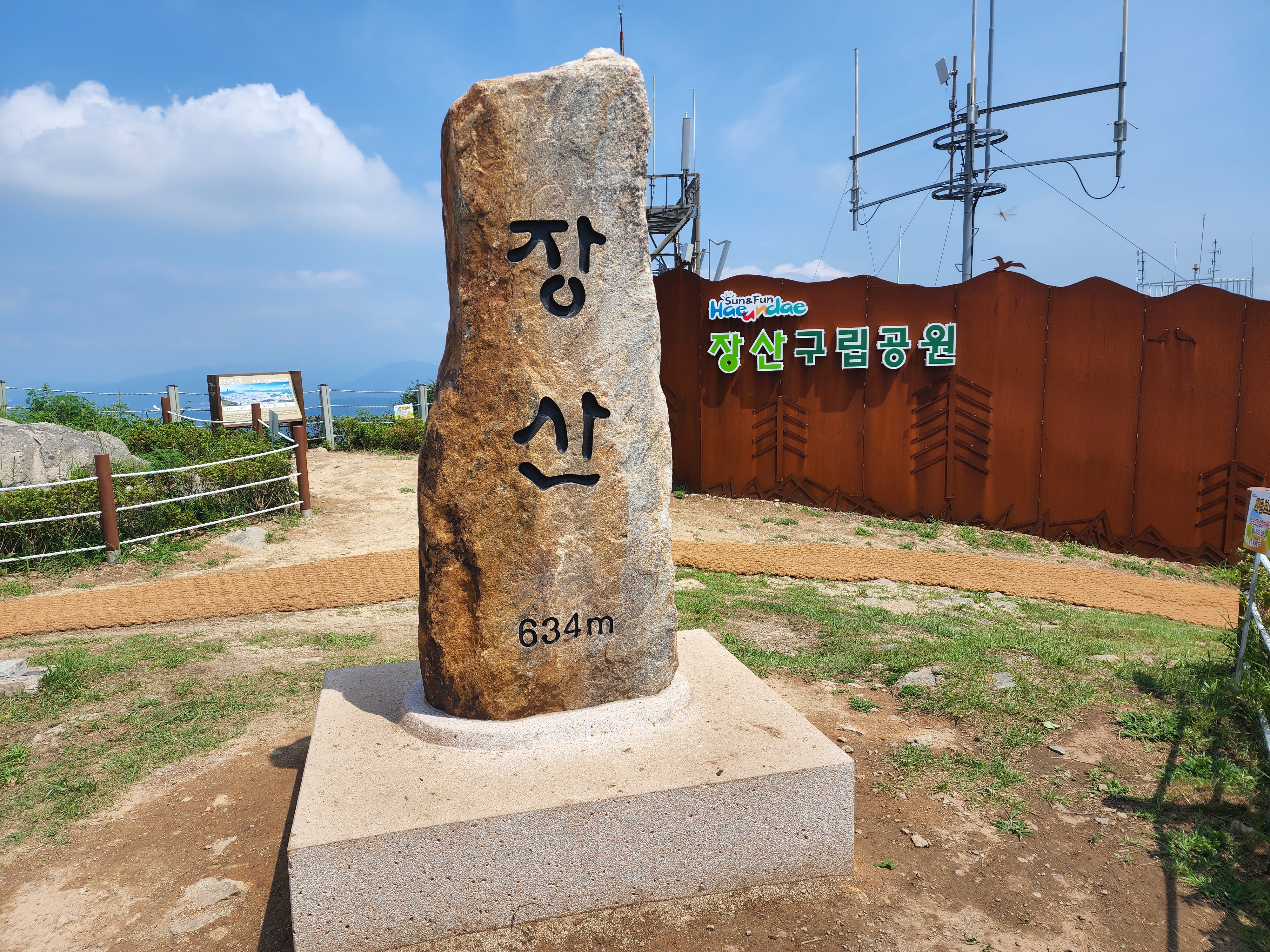 산행코스:동백역(2호선)4번출구=>반도보라담벽 우측(50m)=>장산들머리=>옥녀봉(383m)=>중봉(403m)=>구.정상석=>신.정상석(634m)=>구.정상석=>장군바위=>성불사.너덜길 갈림길=>임도=>성불사입구=>벡스코역6번출구