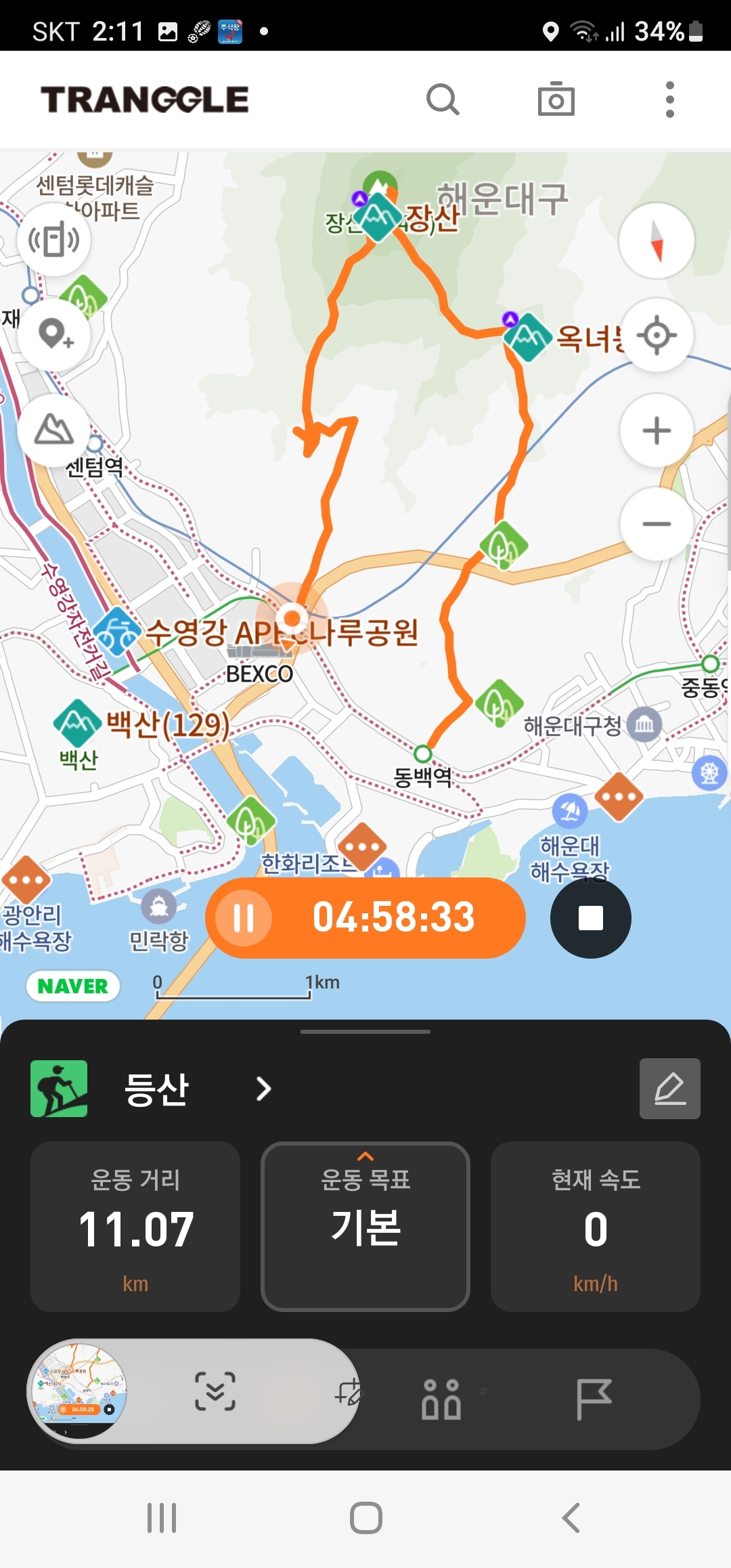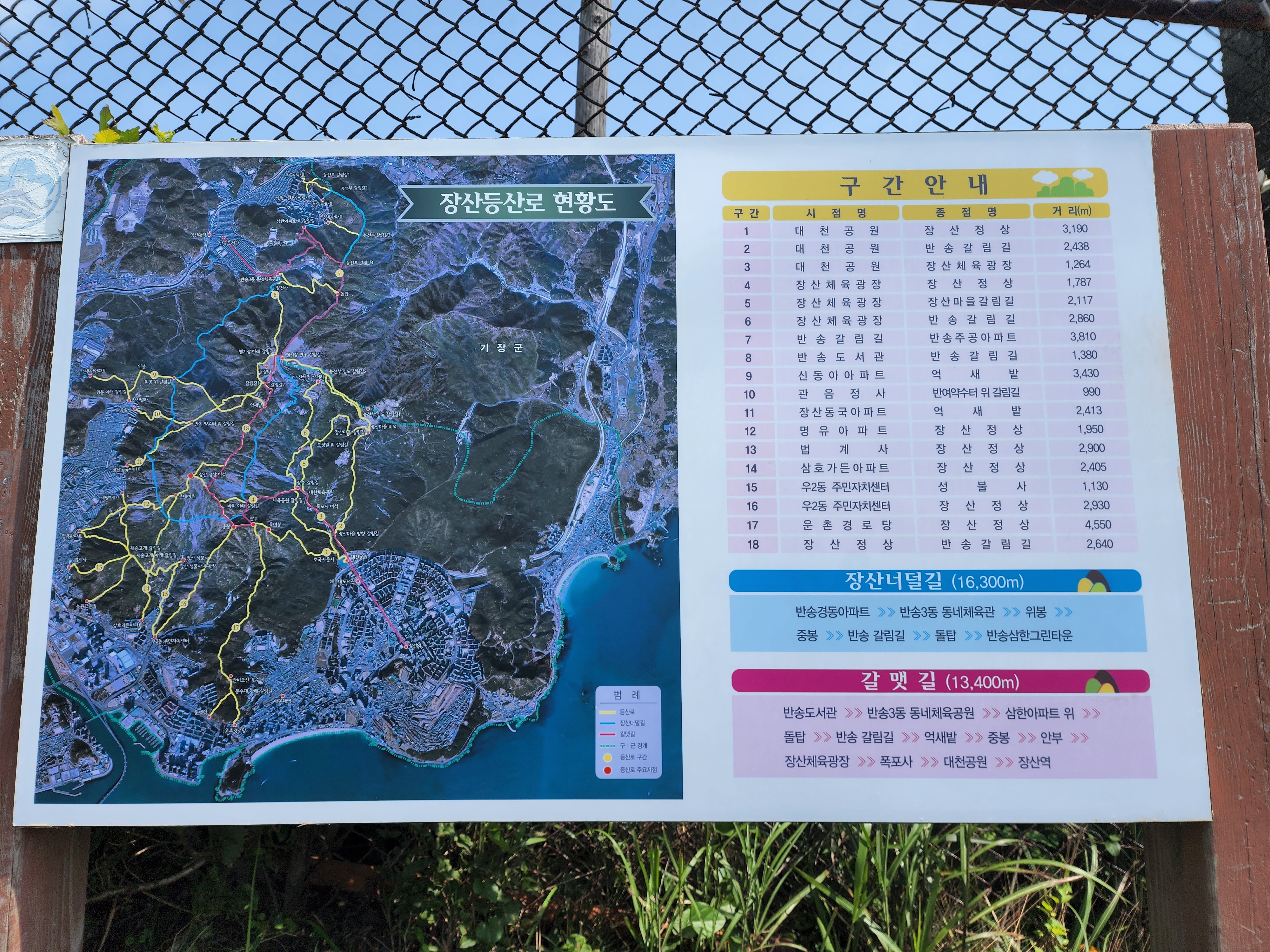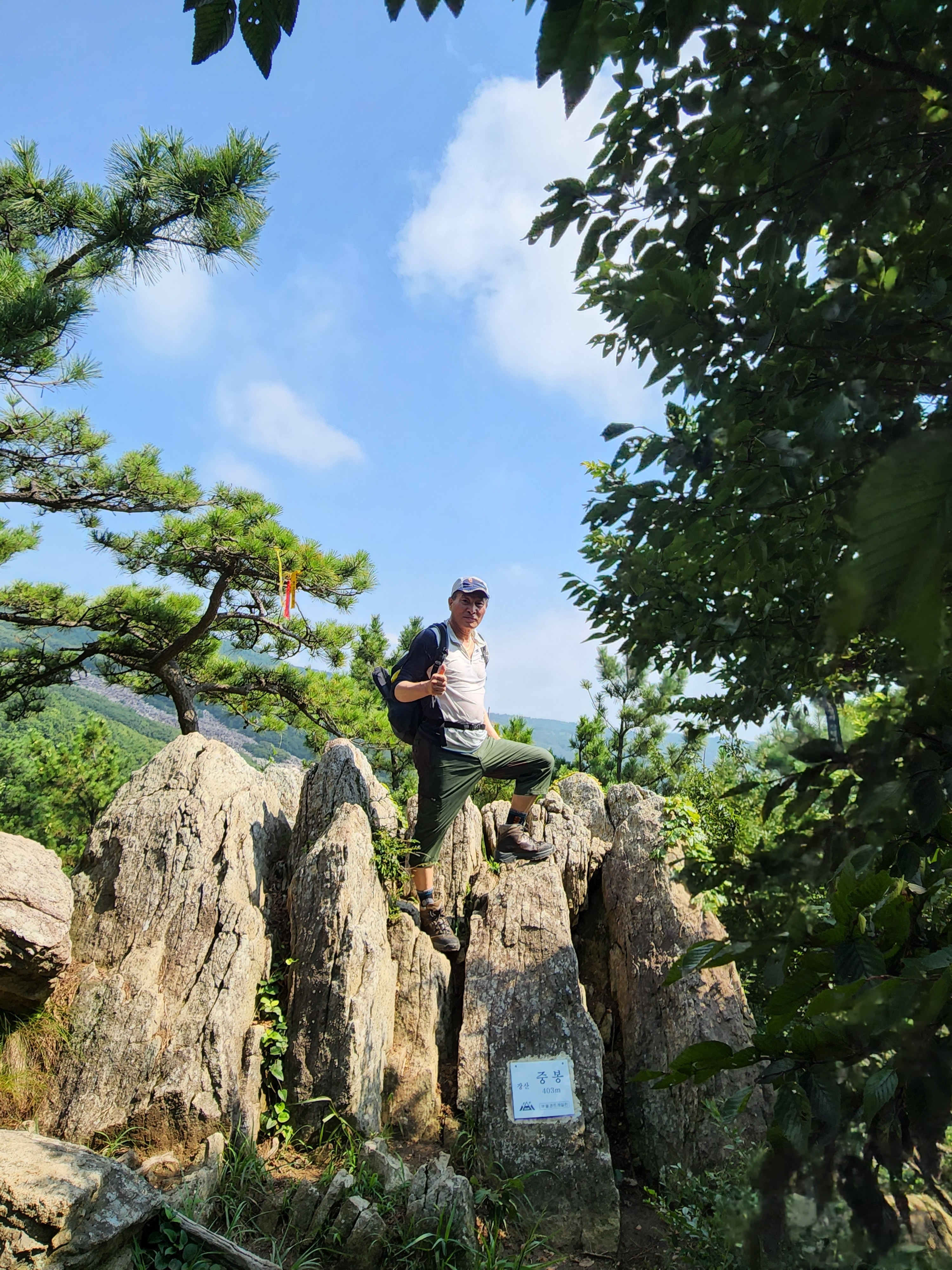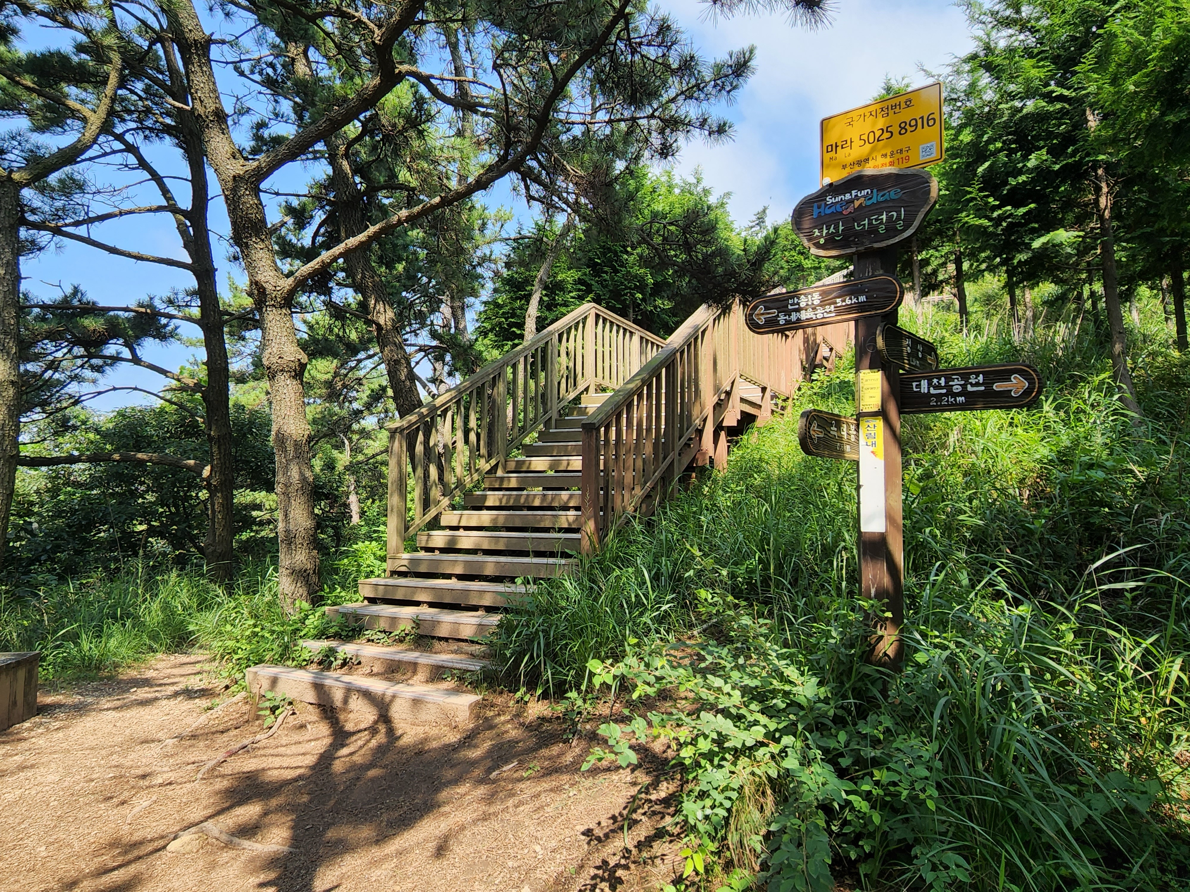 산행코스:동백역(2호선)4번출구=>반도보라담벽 우측(50m)=>장산들머리=>옥녀봉(383m)=>중봉(403m)=>구.정상석=>신.정상석(634m)=>구.정상석=>장군바위=>성불사.너덜길 갈림길=>임도=>성불사입구=>벡스코역6번출구