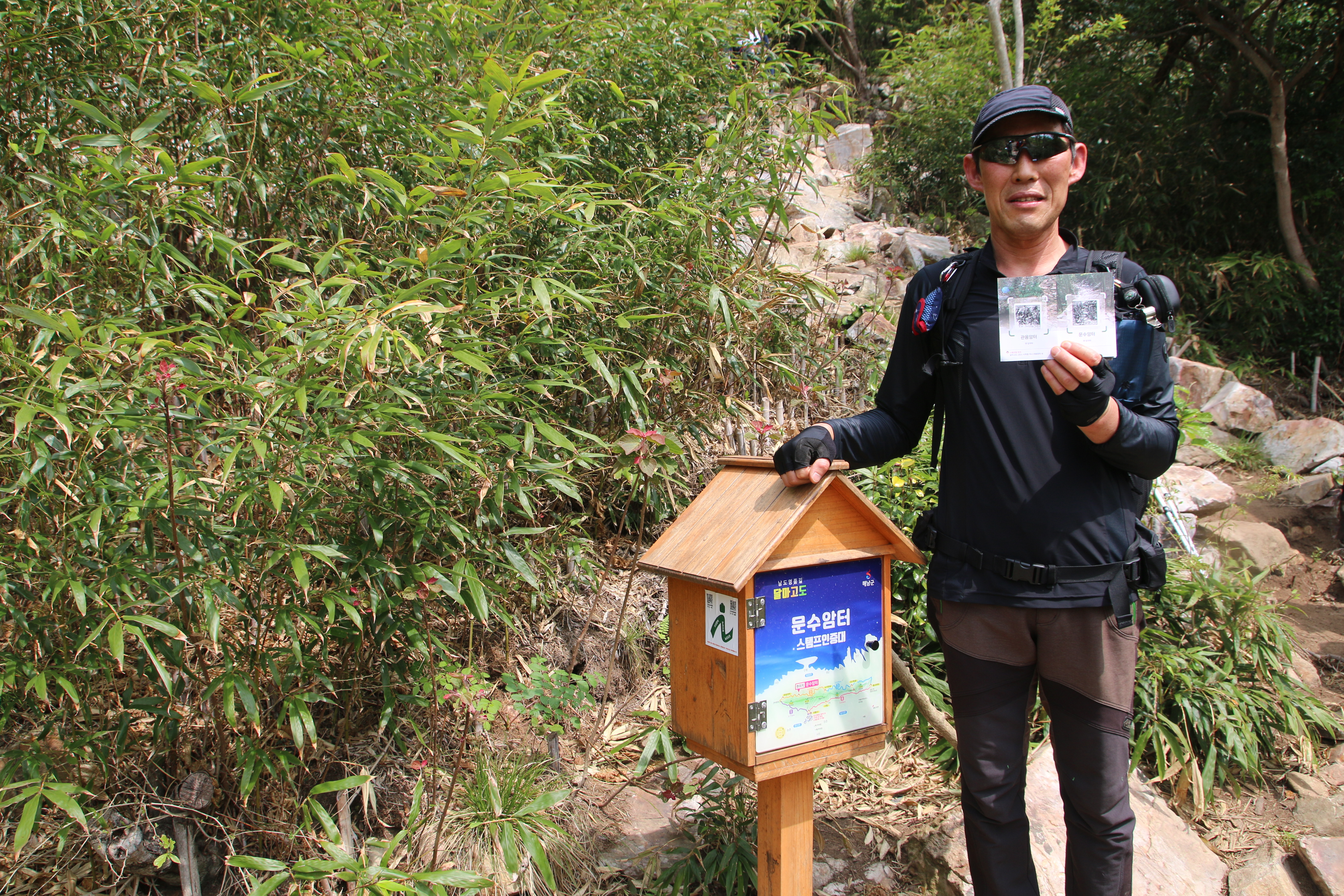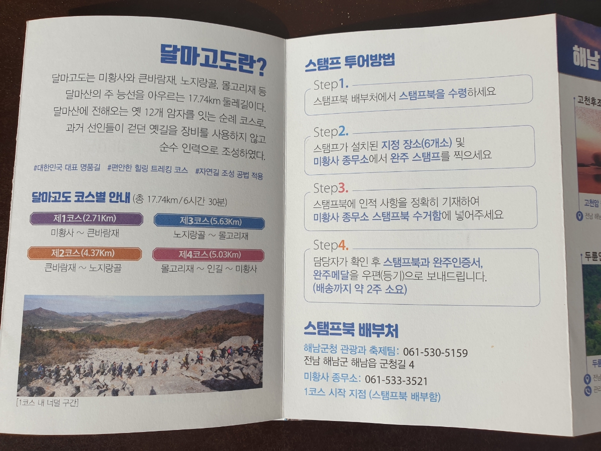 | 달마산.보길도.소안도.등산 (땅끝마을)부산22일Pm11시40분 부산출발 23일04시40분 해남미황사도착 A팀은.달마산과 달마고도둘레길B팀은 완도보길도 이동 05시 산행시작 A팀=미황사=>달마고도 삼거리(달마봉정상0.9km가는길.험한길.너덜)=>무썬봉(달마봉)2.6km가는길=>관음봉(434m)=>공룡능선(험한길.너덜)=>달마봉(489m)=>미황사방향=>달마고도 삼거리(달마봉정상0.9km가는길)산행종료 산행거리5.29km소요시간2시간50분소요 산행종료후.달마고도 둘레길.6구간시점(달마고도삼거리) 달마고도 삼거리(달마봉정상0.9km가는길)=>큰바람재(달마봉가는길)=>관음암터(스템프찍기1)=>문수암터(스템프찍기2)=>노랑지골(스템프찍기3)=>도시랑골(스템프찍기4)도솔암 삼거리=>도솔암=도시랑골 도솔암 삼거리(빽)=>몰고리재(스템프찍기5)=>너들지대(스템프찍기6)=>미황사종무소(스템프수거함) 산행거리:19.61km 소요시간7시간59분소요(도솔암.거리.시간포함) 총산행거리:25km B팀=미황사A팀하차후 완도 화흥포항이동6시40분첫배 차와함께승선 소안도 소안항에7시20분도착 소안도(가학산)산행후.소안항에서11시10분 차로이동 보길도 동천항11시20분도착 곡수당으로이동12시10분산행시작 보길도(격자산) 산행후 화흥포항 도착하여 미황사로이동 달마산 등산후 종료 산행코스:미라지점=>소안도(가학산) 원점회귀 2.6km 산행코스:보길도 곡수당=>보길도(격자산) 원점회귀4.22km 산행코스:미황사=>달마고도 삼거리(달마봉정상0.9km가는길)=달마봉=>미황사 원점회귀2.6km A팀B팀05시에미황사도착하여 17시20분에 산행후 미황사에서 합류하여17시40분 부산으로이동20시50분귀가 |