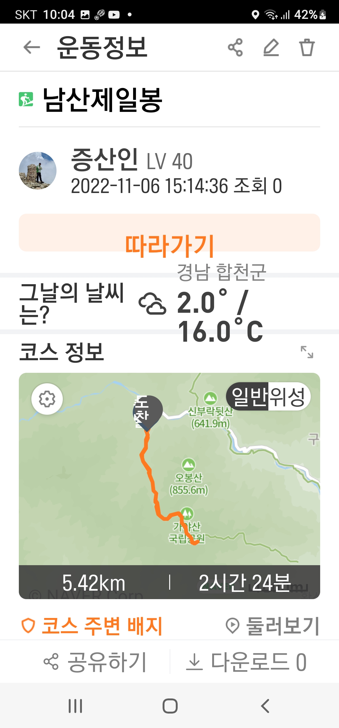 산행거리:약5.42km 산행시간:2시간10분소요 (100대명산3차)