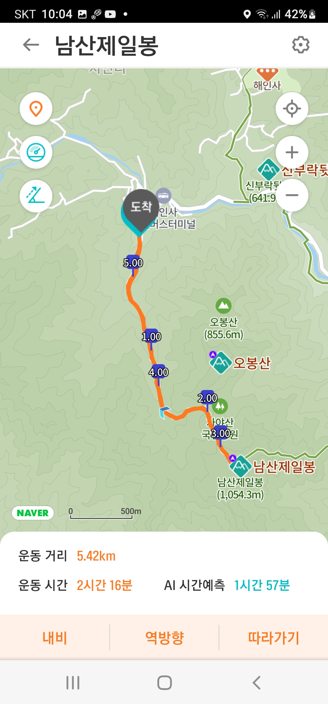 2차산행코스:돼지골 탐방지원센타=> 오봉산중턱=>남산제일봉(1010m)=>돼지골 탐방지원센타 원점회귀