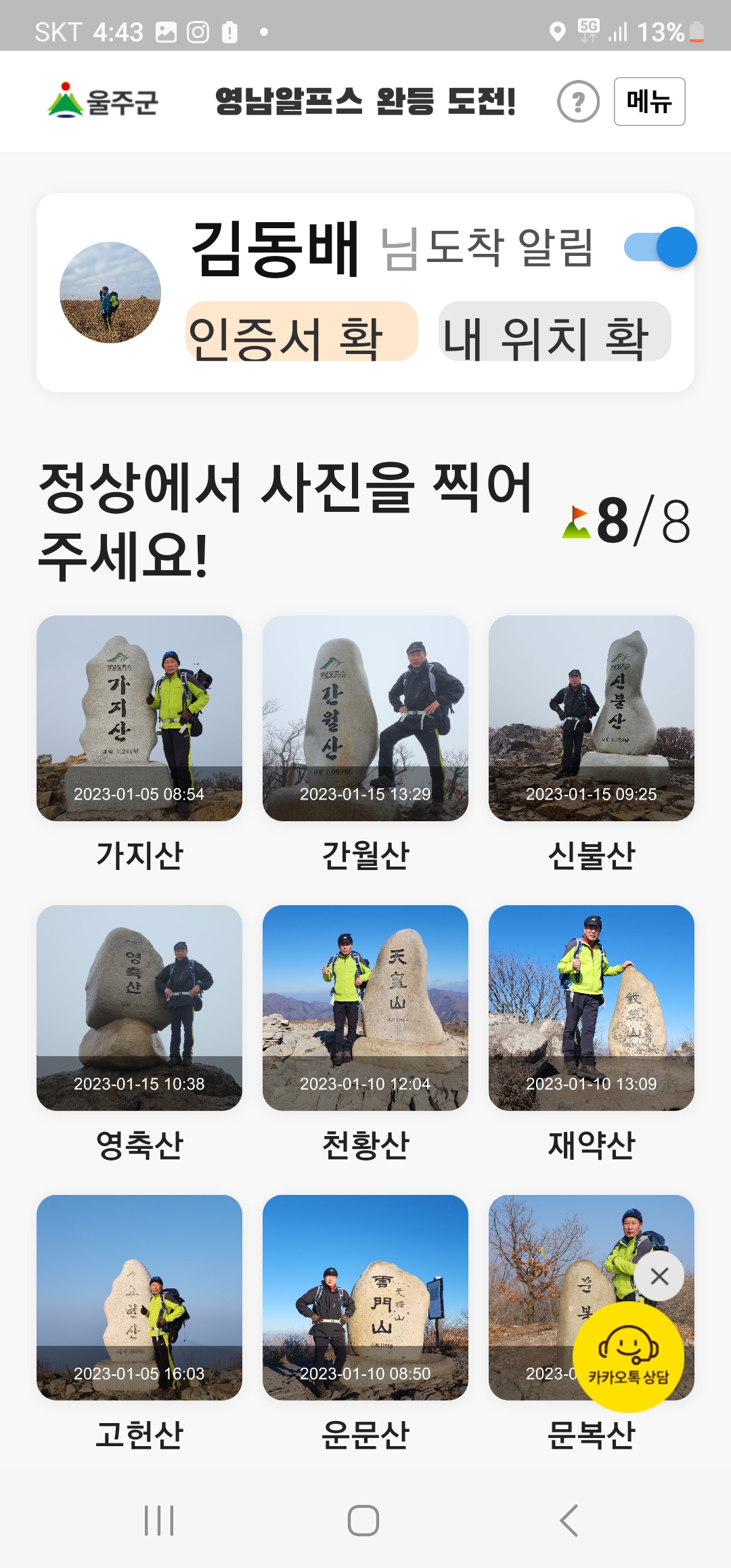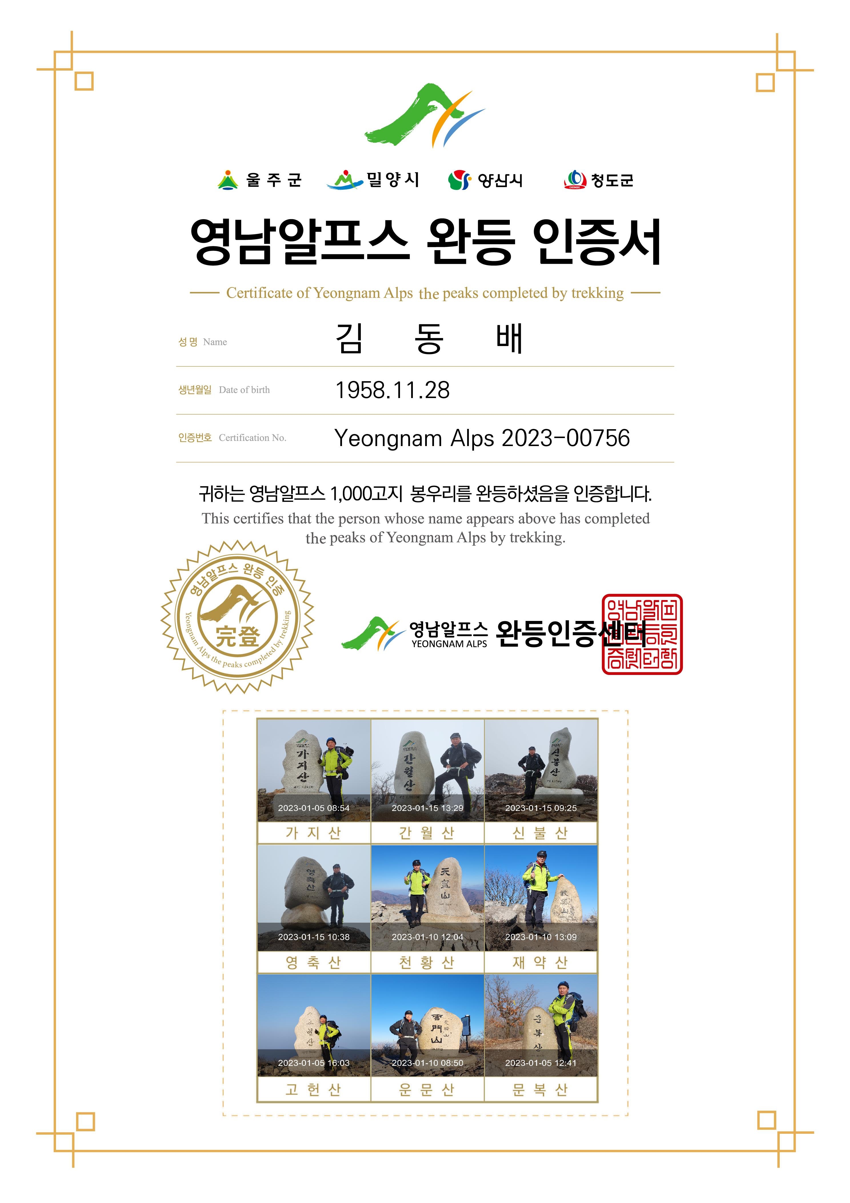 영남알프스 인증1년1회=>10회 2023년1월15일3회인정 완료